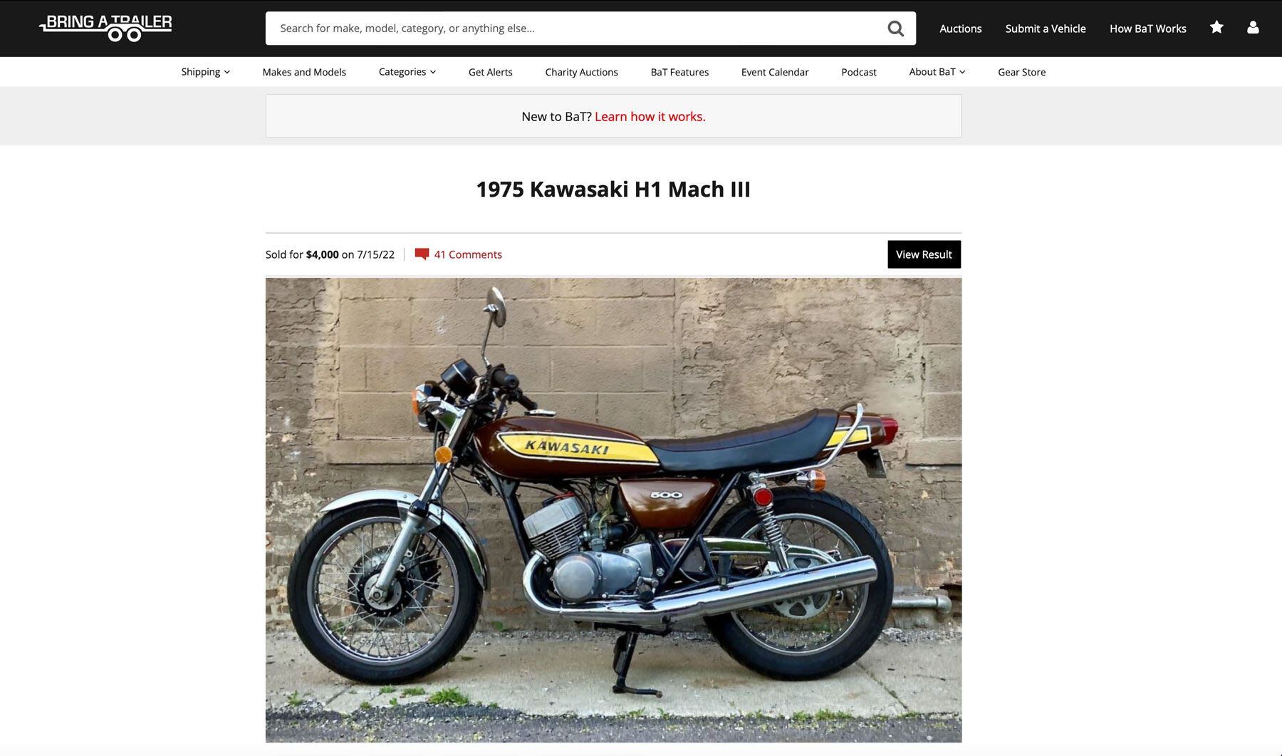 It is a pure white ’71 S2350 on the pedestal. That’s excellent. It seems to sign up for Kawasaki BaT list alerts. And until I find the right one, I will comment on what isn’t. Let’s do it again.