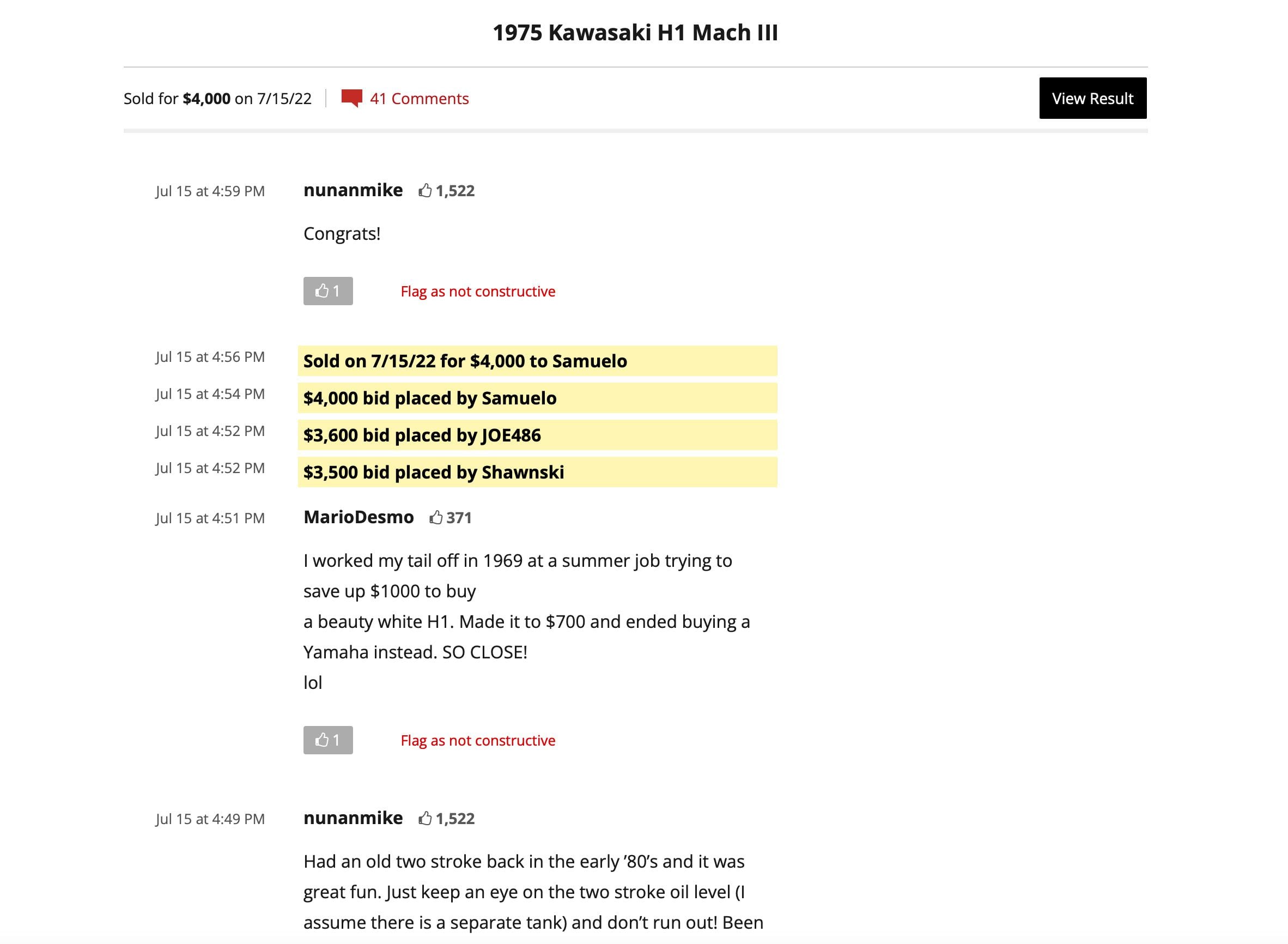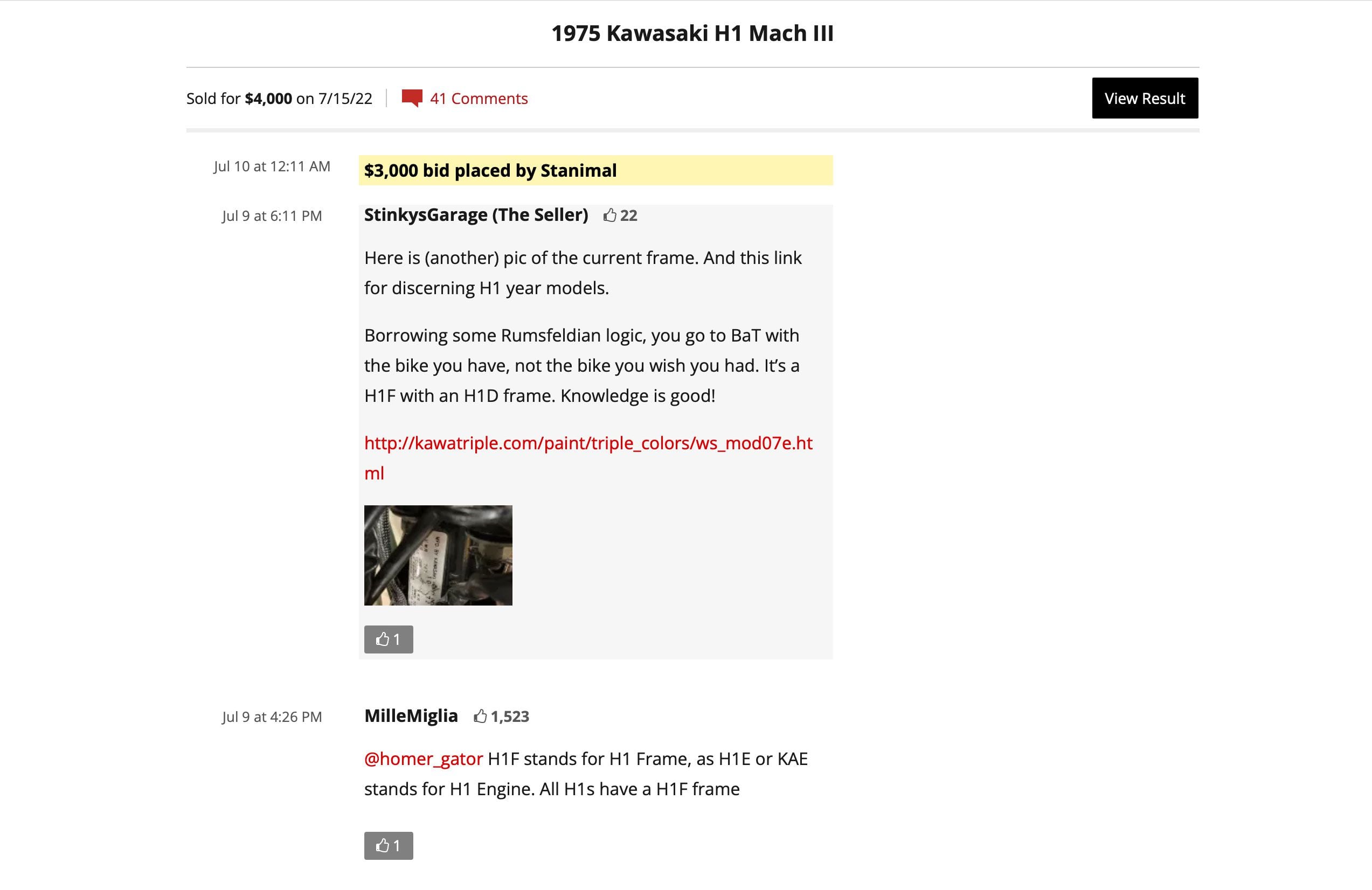 To stir the pot, I’ll post a photo of a pointless upgrade. Periodically procure the correct Kawasaki Master Cylinder Cap and install the speedo cable-stayed bridge. But the BaT community isn’t moved by my meticulous work. Someone wants to see the bike in person. No problem, I will reply. I will never be contacted by them. It’s pretty standard. Most comments are pointless just to recall about H1 from people who wouldn’t buy it. It’s also pretty standard. There are 7 hours and 43 minutes left a day.
